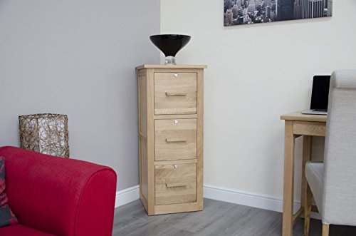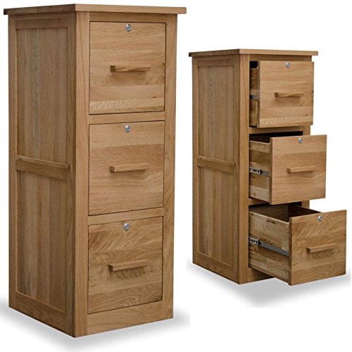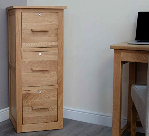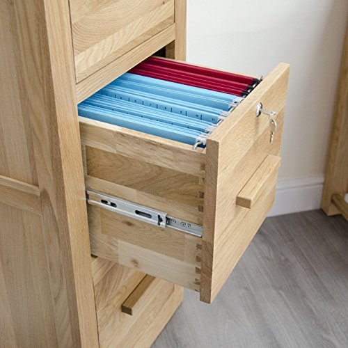 Superb contemporary three drawer filing cabinet The overall dimensions of this item are H109 x W46 x D45 cm Has a lock on each drawer for secure storage Comes complete with two keys The drawers hold A4 suspension files on steel rail Matches the stunning Arden solid oak small and large computer desk Manufactured to the highest quality Constructed using 100% solid oak including backs, sides and insides of drawers No veneers are used whatsoever Designed to last a lifetime Dovetail joints used on drawers Finished in a beautiful clear lacquer to offer your furniture protection as well as enhancing its natural beauty Comes with oak handles but metal bar handles can also be provided if you require Comes readily assembled Part of our amazing Arden Solid Oak contemporary furniture collection