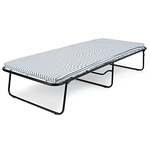 Folding Single Guest Bed with Mattress. 1 x guest bed. 1 x medium-feel foam mattress. Quick and easy to set up and fold away. Durable tubular metal frame. Legs lock for maximum security. Steel sprung base. Superior support and comfort. Compact size for simple storage. Great for a spare room. Perfect for putting up visitors. Set-up size (cm): L192 x W79 x D40. Folded size (cm): L94 x W80 x D11. This compact guest bed is simple to set-up, easy to fold away and perfect for putting up visitors. The single folding guest bed has a steel sprung base and includes a firm foam mattress, providing superior support and comfort for a sound night’s sleep. Setting up the foldaway guest bed couldn’t be easier. Simply unfold both sides, push the legs down and lock into place. The fold up guest bed has been constructed with a tubular metal frame, which is durable yet lightweight to easily pick up and store away.  To stop floors getting scratched and carpets getting scuffed, the visitor bed features plastic feet on all three folding legs. Its compact size makes the folding single bed a great space saving solution for a spare room and perfect for taking on camping trips. 1 x folding single guest bed 1 x medium-feel foam mattress Pre-assembled  Durable tubular metal frame  Comfortable steel sprung base Plastic feet to protect flooring Quick and easy to set-up and fold away Compact size for easy storage Set-up size (of frame) (cm): L192 x W79 x D40 Set-up size (of mattress) (cm): L180 x W73 x D5.5 Folded size (cm): L94 x W80 x D11 Please Note: Bedding for illustrative purposes only.