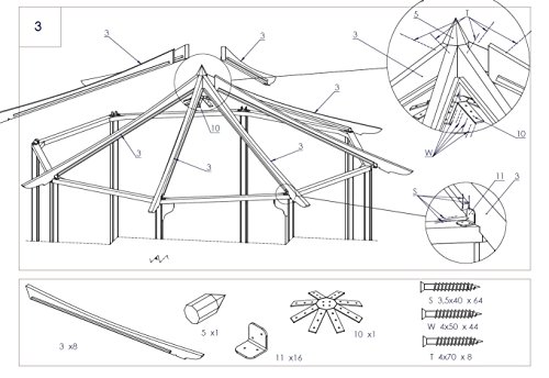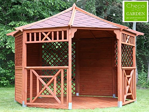 Wooden octagonal gazebo diameter 3.5 m Elements included in the price: !All Side Panels (11) and 2 handrails! 8 x posts 70mm x 70mm 1 x protractor to set the posts 8 x wooden beams for roof binding 10 x wooden struts 8 wooden rafters wooden ending to the top 16 x metal brackets metal cross to connect the rafters 8 finished wooden roof panels (cladding) 16 finished slats for roof panels Elements not included: roof shingles table chairs floor decking (ask us about it if you’re interested) IMPORTANT! Make sure that you buy from us, not the scammers! Always look on the “Dispatched from and sold by” to make sure you buy from CHECO LTD and not any other seller!