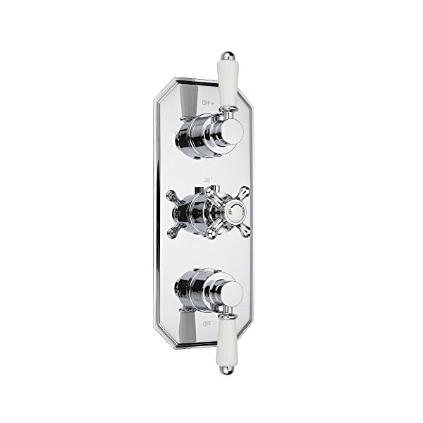 Improve the look of any traditional bathroom or en-suite with the Milano Victoria concealed thermostatic shower valve. Boasting an elegant design and a rust-resistant chrome finish, this thermostatic shower valve with diverter delivers water to three separate outlets such as a hand shower, fixed shower head and body shower. With a solid brass construction, this TMV2 approved shower valve incorporates anti-scald technology to guarantee a safer showering experience. It also utilises ceramic disc technology for the prevention of drips and leaks.Milano Victoria Traditional Thermostatic Shower Valve Features: