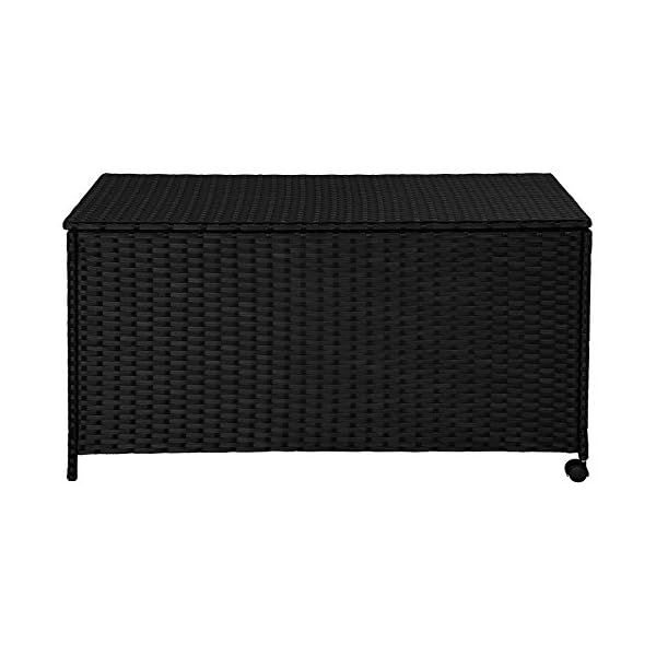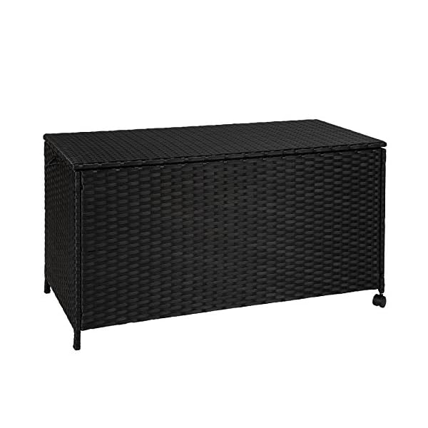 The stable and classically designed cushion box made from convenient and easy-care poly-rattan ensures lots of storage space for your seat covers, cushions and further garden utensils. The frame is made from powder-coated aluminium and is especially robust. The two useful wheels and the handle ensure an easy transport. Get this cushion box for your home.