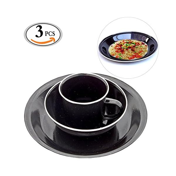 Travelmall 3 PCS Black Enamel Camping Picnic Dining Set Plate Mug Bowl Outdoors Dinnerware Tableware Set Enamel Cereal Bowls Travel and Camping Cutlery Set for 1 Person(3pcs-Black)