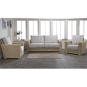 Desser Samford Rattan Conservatory Furniture Set – 2 Seater Sofa & 2x Armchairs – Fully Assembled Luxury Indoor Real Cane Wicker Chairs & Settee Suite with UK Made Cushions – Athena Stripe Fabric