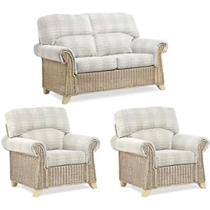 Desser Clifton Rattan Conservatory Furniture Set – 2 Seater Sofa & 2x Armchairs – Fully Assembled Luxury Indoor Real Cane Wicker Chairs & Settee Suite with UK Made Cushions – Athena Check Fabric