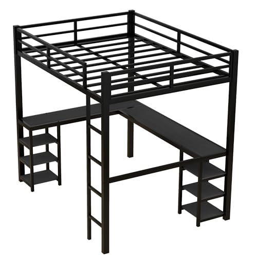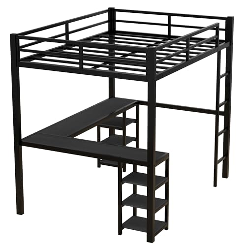 🥇🥇 【L-Shaped Desk for Full Loft Bed: Multifunction】This full size loft bed includes a L-shaped desk and 6 square shelves on corner. 57.6 under-bed clearance that you can turn the space into a clever workstation, a reading nook or a craft area. The large desk and shelves are made of thickened MDF board which provides better weight capacity. L-Shaped Desk weight capacity: 150LBS, Each shelf weight capacity: 22LBS.