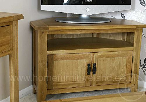 The Westbury Rustic Solid Oak Corner TV Stand is handmade from quality Solid oak and oak veneers. Our Rustic stand is timeless in design and can fit into a variety of room styles. At the top of this TV stand is a sturdy shelf and below are two cupboards which feature elegant, pendant metal handles. Rounded corners and dowel detailing give a farmhouse look to this TV stand.
