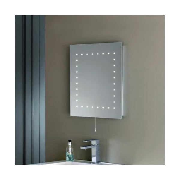 Modern slimline illuminated bathroom mirror with 32 ultra-bright LED lights. Features a bevelled edge and integrated chrome pull-switch to turn the lights on and off. IP44 rated – fully certified for safe bathroom installation.