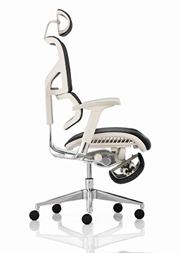 , Soft designer mesh seat and split back , Unique auto adjusting patented lumbar support , Pivoting and height adjustable arms ,Headrest, Synchronised mechanism and seat slide, Leather seat